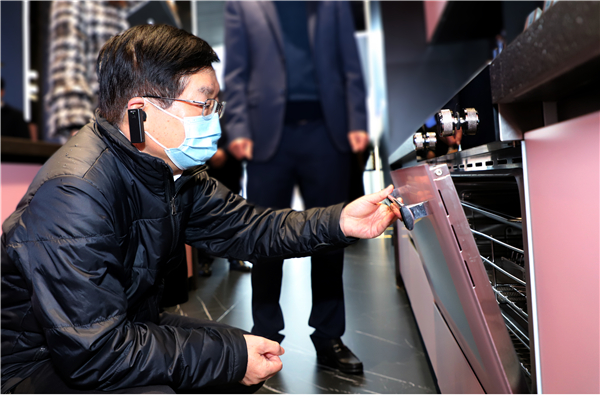 在调研过程中,郑继伟副主席还“现身说法”,现场使用、体验了S9冰蒸一体等最新亿田集成科技。通过实景的调研考察与亲身体验,郑副主席对亿田集成灶、亿田集成厨房所蕴藏的厨房生态科学与“无烟-无害-无人”的厨房功能给予高度评价!并鼓励亿田继续立足厨电现代化智造、智能化生产,以行业引领的实力与魄力,推动整个嵊州乃至中国厨电事业不断升级、前行!