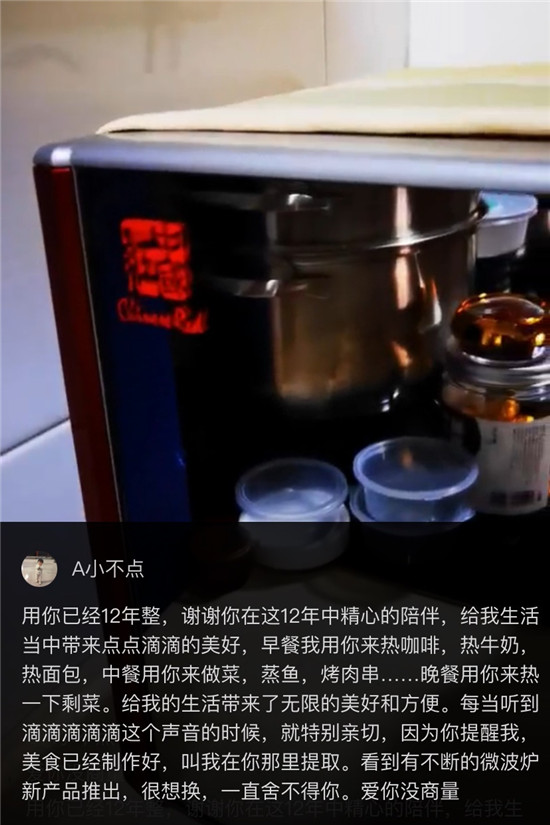 “已经12年整,谢谢你在这12年的精心陪伴,给我生活带来点点滴滴的美好,早餐我用你来热咖啡、热牛奶,午餐用你来做菜、蒸鱼,给我的生活带来了无限的美好和方便。”一名叫AI小不点的网友在晒出在家中国红微波炉时感慨道。(需截图截到China Red)