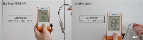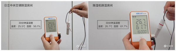 广州地区雨后空气湿度可达100%,一场“比拼”就在这里进行。一沿江小区的两个同样的房间内,分别放置除湿机与日立中央空调,测得初始湿度为78.8%和76.8%,测试正式开始。运行30分钟后,日立温湿双控内机就已经达到了设定湿度值50%,而摆放除湿机的房间内,一个小时测得室内湿度仍然为60.7%。