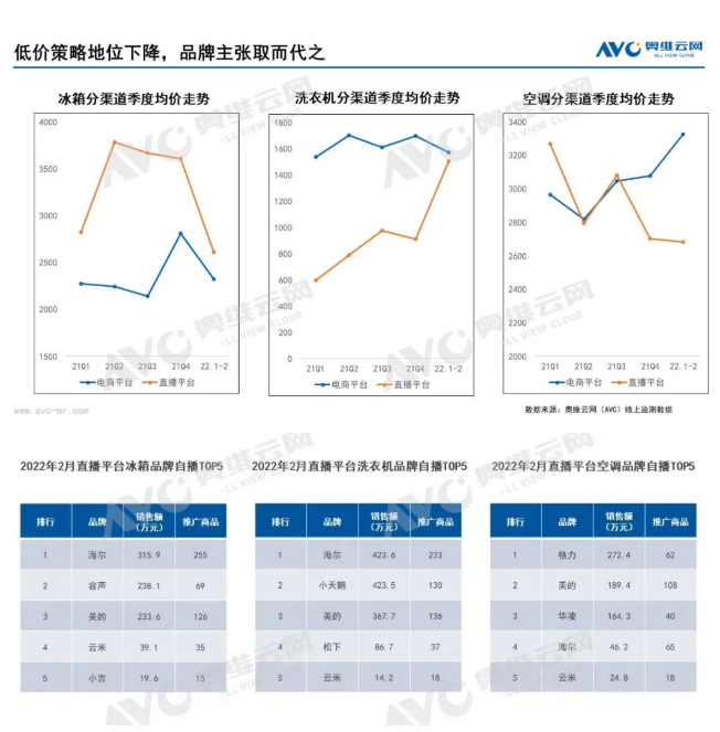 随着头部品牌加速进入直播渠道,并借助直播平台展开新一轮的市场拓展。直播渠道的争夺快速呈现品牌化、集中化趋势,直播渠道不再只是以低价策略吸引消费者,也会带来探索未来发展空间和动力的策略。2021年直播平台冰箱市场均价为3617元,以天猫、京东为代表的电商平台冰箱均价为2365元,直播平台冰箱均价高于电商平台1252元。空调直播平台均价2856元,电商平台均价2934元,价差仅为78元。价格差异的背后,主要来自于直播电商的消费人群有别于天猫、京东等电商平台,集中在35岁左右的小镇青年。基于这样的人群基础,一方面TOP品牌在下沉市场有更高的品牌认知与优势,另一方面直播电商通过更精准的兴趣推荐,转化不同消费需求,形成多元化的消费结构。洗衣机较为特殊,因产品离散程度较高,直播平台主推是以轻小洗、内衣机为主,与其他电商平台在产品上差异较大,21年均价仅为836元。从分季度走势来看,冰箱、洗衣机、空调品类的价格逐渐趋同,这无疑是品牌加大布局以及竞争带来的结果,拉动家电企业在直播渠道“推高卖精”营销转型落地。