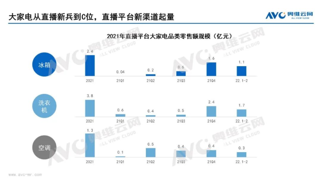 据奥维云网(AVC)《大家电直播电商平台分析报告》,2021年直播平台大家电冰箱、洗衣机、空调三大品类零售额分别为2.4亿元、3.8亿元、1.3亿元,均已达到较为可观的体量。分季度来看,大家电从Q1开始逐步起量,冰箱从21年Q1的0.04亿元增长到Q4的1.6亿元。洗衣机从0.6亿元逐渐增长到2.4亿元。空调也从0.1亿元发展到0.4亿元的规模,发展势头强劲。奥维云网大家电研究员王蕾认为,由于抖音快手等直播、短视频平台加速商业化变现,直播平台和企业互动加强,品牌企业开始重视直播平台的业务增量以及内容运营对私域流量的导流作用,在业务模式和大家电产品的物流配送安装以及售后服务等商业流程的跑通和逐步完善后,2022年极有可能迎来大家电直播电商发展的元年,品牌企业快速布局正当其时。