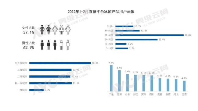 用户方面以冰箱为例,直播平台中男性是购买的主力人群,占比62.9%,而女性仅为37.1%。从年龄分布来看,80、90后年轻用户占绝对优势,其中31-40岁占比为38.8%。这些用户具体到城市级别的分布情况,四五线城市占比最高为30.5%,其次是新一线城市21.1%、三线城市20.9%。从用户画像中不难看出,大家电领域依旧是下沉市场青年男性偏好度较高,主要原因也是由于较高的经济能力以及对品质生活的追求使得这些高活跃用户更愿意接受和尝试新鲜事物。