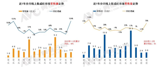 时间来到2022年,集成灶整体仍旧延续着强势的增长势头,据奥维云网数据显示,2022年1、2月份全渠道零售合计22.0万台、20.1亿元,零售量同比增长9.9%、零售额同比增长25.9%,可见市场需求庞大。