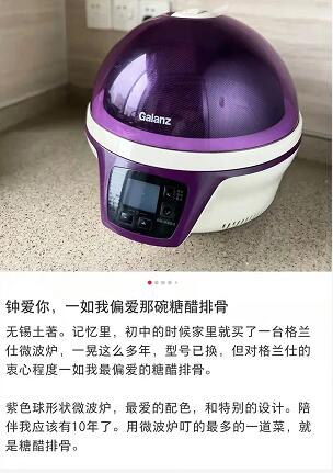 “记忆里,初中的时候家里就买了一台格兰仕微波炉,紫色环形状微波炉,最爱的配色和特别的设计,陪伴我应该有10年了。用微波炉叮的最多的一道菜,就是糖醋排骨。”粉丝@徐微墨留言道。
