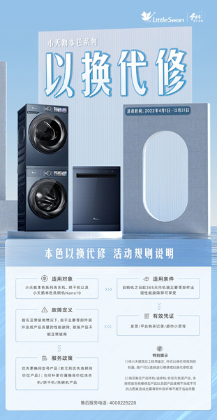 从2022年4月1日开始,小天鹅将针对本色系列洗衣机、烘干机、洗碗机Nano10产品,面向用户推出购入365天内因主要零部件(压缩机/电机/电脑板/轴承等)损坏造成的故障性问题“以换代修”活动。小天鹅本色系列用户可以优先更换同型号产品(如无,则优先选择同价位产品)。活动将一直持续到2022年12月31日。