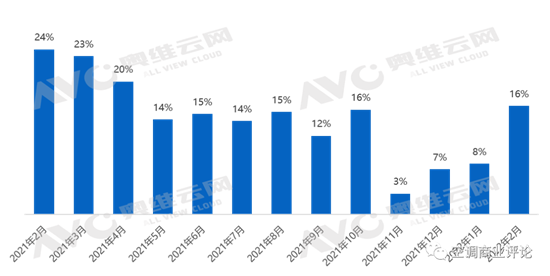 奥维云网零售监测显示,2022年1-2月家用空调零售线上同比增长11.6%,线下同比下滑13.6%。整体呈现不温不火的状态。一方面全国范围内区域性的疫情反复,造成上游供应链环节部分产品短缺,生产端供给不足。另外一方面整个开工装修节奏同步滞后,家电及安装属性的产品都受到影响。
