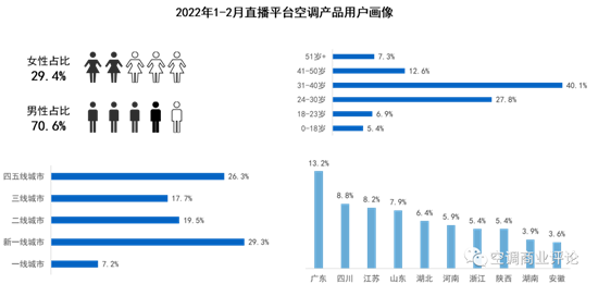 除换新市场的不断掘金,随着乡村物流与网络设施完善、消费能力和观念的转变,尤其是京东、天猫等平台在下沉市场不断发力,不断激活了下沉市场。而以抖音、快手、拼多多为代表的新零售渠道,用户大量在三四线及新一线市场。用户方面以空调为例,抖音平台中男性是购买的主力人群,占比70.6%,而女性仅为29.4%。从年龄分布来看,80、90后年轻用户占绝对优势,其中31-40岁占比为40.1%。这些用户具体到城市级别的分布情况,新一线城市占比最高为29.3%,其次是四五线城市26.3%、二线城市19.5%。从用户画像中不难看出,大家电领域依旧是下沉渠道青年男性偏好度较高,主要原因也是由于较高的经济能力以及对品质生活的追求使得这些高活跃用户更愿意接受和尝试新鲜事物。