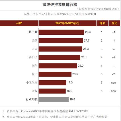 只有真正理解用户,与用户共同成长的品牌,才能在不断迭代的消费群体中保持着几十年如一日的用户口碑。近日,由中国知名品牌评级与顾问机构Chnbrand发布2022年中国顾客满意度指数C-CSI研究成果及排行榜发布,格兰仕微波炉再次位居榜首。
