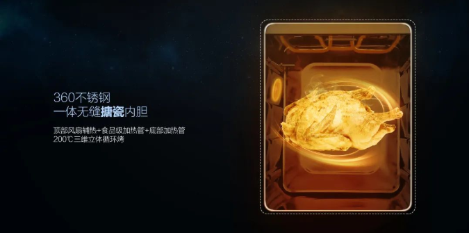 在烤功能模块,佳歌A6DZK采用耐高温、耐腐蚀、耐热性好、一擦即净的360不锈钢一体无缝搪瓷内胆,同时配备“顶部风扇辅热+食品级加热管+底部加热管”三维立体循环烤系统,三维立体加热让烤箱内每一个角落温度一致,最高温度可达200℃,更大限度保证食物色香味俱全。