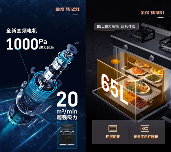 这是一个全力布局产品、精研厨房场景的新机遇,随着金帝智能集成厨房产业园的全面启动,新一轮高品质集成厨电产品生产也正式开启,全系列产品将从性能、外观等层面进行全位升级,R901ZK蒸烤一体集成灶率先亮相。超高性能变频电机(1000Pa超大风压、20m3/min超强吸力)、65L自动激光一体弧接工艺焊接内胆的蒸烤箱,搭配燃卡脱脂蒸、双管变频烤、皇冠免清洗技术等全新的功能,金帝再次开启产品新范式。