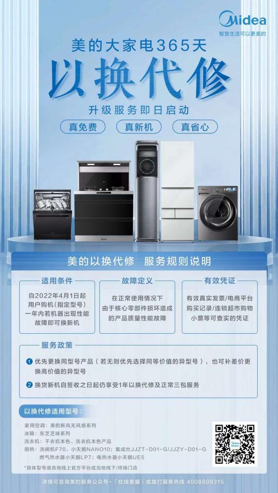 自2022年4月1日起,美的承诺用户购买美的大家电,包括但不限于空调、洗衣机、冰箱、热水器、厨电等其他大家电的指定型号产品,在365天内若机器出现性能故障(非人为因素损坏),经售后鉴定符合条件后,用户凭借有效凭证(有效真实发票、电商平台购买记录、连锁超市购物小票等),可自主选择“以代换修”服务权益,美的将无条件100%免费换新机、100%换全新机,根据不同购机渠道,线上由商家进行换机服务,线下由售后通过总部提供新机流程进行换机服务,从而解决用户售后维修难题,开启焕新品质新生活。