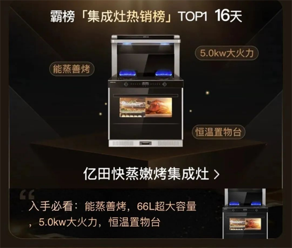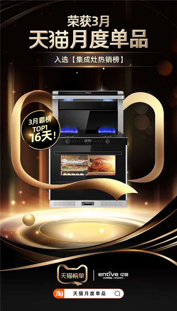 近日,天猫平台3月榜单正式公布!亿田D2ZK蒸烤一体集成灶继“2021年度全网第一单品(集成灶品类)后,再次“亿”骑当先,不仅成功入选【集成灶热销榜】并摘获3月天猫月度单品等荣誉,更以3月霸屏榜单TOP1逾16天的超强势能,全面领先同行业其他产品,用官方平台认证&消费者喜爱的双重超级战绩,打响亿田2022年全年战役开门红。