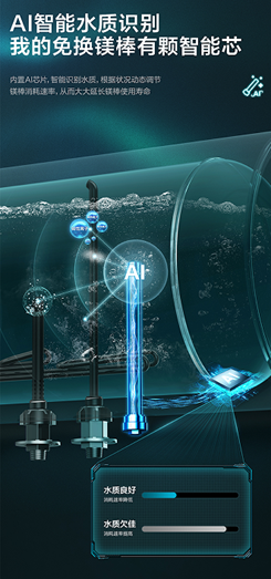 与传统镁棒不同,通过大量的技术积累和试验认定,从结构、原理上实现真正意义上的“免更换”,美的电热水器JA7美的全新革命免换镁棒技术,采用超级AI自学习芯片,能够根据国内不同地区水质情况,主动识别水质,自动调节镁棒消耗,精准保护内胆免受侵蚀,并且表面不易结垢,使用时间可达8年以上,相当于终身免换,不仅解决了用户频繁更换镁棒的烦恼,而且提升水质健康,让用户省钱更省心。