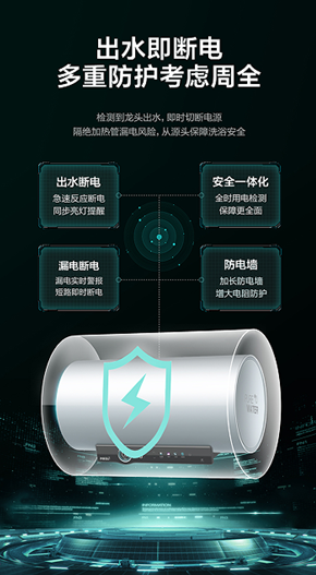 美的电热水器JA7,全新安全升级,具备出水断电技术,能够自动检测龙头出水,会立即切断电源,此时屏幕灯会熄灭提示,更好的隔绝加热漏电风险,一旦发生漏电、短路等状况,便会即时断电,并实施报警。此外,它还拥有防电墙专利技术的加持,加长防电墙,增大电阻防护,全面保障家人洗浴安全。