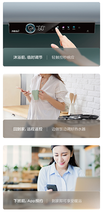 此外,美的电热水器JA7还突破传统按键,支持多种智能操控方式。沐浴前,用户可根据沐浴需求,用手轻触显示屏,即可秒响应。与此同时,用户还可以通过下载美的美居APP,远程控制热水器多种功能,下班提前APP预约,回家就享受温度适宜的洗澡水,大大节约了用户的时间和精力,让用户畅享便捷沐浴新体验。