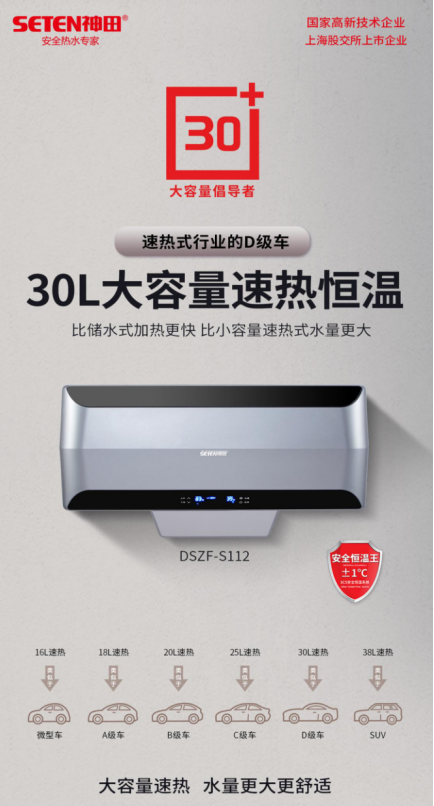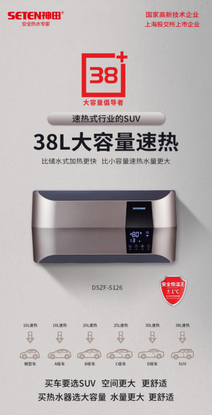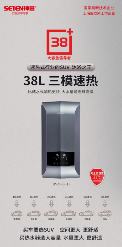 作为专业品牌,神田集团在2019年就否定了小容量速热的开发方向,坚持开发大容量速热产品的方向,经过三年的布局,大容量速热因为水量充沛,性能稳定,现在成为了速热产品的主流产品。