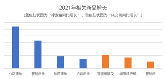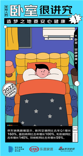 与其它空间不同,卧室内物品无论从视觉上还是材质上可以归纳为一个字:亲肤;比如“面包床”这种包裹性较强,同时视觉效果上更具亲和力的产品,以及乳胶枕、床垫,甚至包括助眠仪、按摩仪等产品的材质,更具有安全性和亲肤性,京东上相关搜索情况显示,用户在搜索卧室内相关产品时,对安全、环保、净化等关键字的敏感度高于平均值650%。