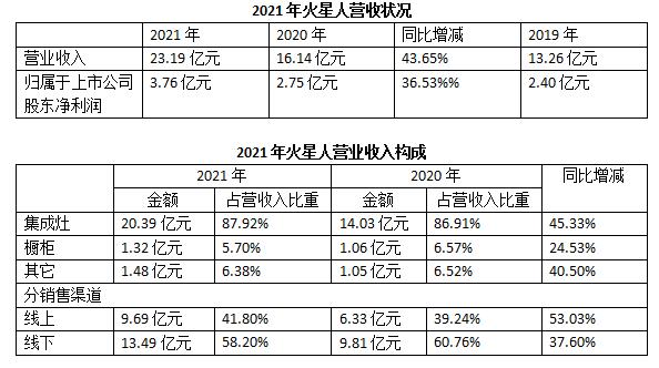 从过去几年的发展历程来看,线上线下渠道互融互通,双轮发展一直是火星人保持高速发展的秘诀。从年报披露的数据来看,2021年火星人线上线下分别贡献营业收入9.69亿元和13.49亿元,同比去年分别增长了53.03%和37.60%;其中线上销售占比提升了2.56百分点到41.80%,线下收入占比为58.2%。奥维云网数据显示,2021年火星人线上销售额市占率为23.35%,位列行业第一。