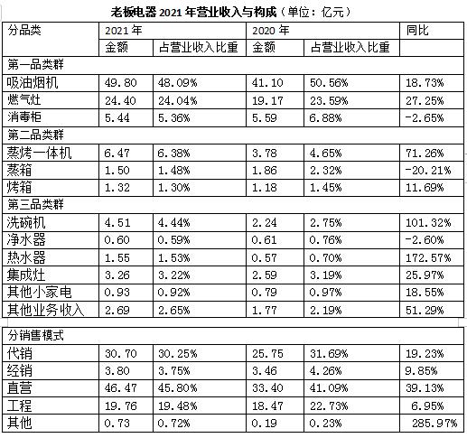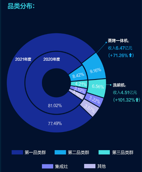 ,老板电器目前将产品分为三大品类及集成品类,第一品类群包括吸油烟机燃气灶和消毒柜,其中,吸油烟机和消毒燃气灶相较于2020年增长分别达到18.73%和27.25%;第二品类群包括蒸烤一体机、蒸箱和烤箱,蒸烤一体机营业金额同比增长71.26%;第三品类群中包括洗碗机、净水器、热水器和集成灶等等,热水器同比增长172.57%。