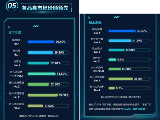 同时,根据奥维云网(AVC)统计显示,老板电器在线上市场中,在厨电套装、烟灶两件套、吸油烟和嵌入式电蒸箱品类获得市场第一,零售额市场占比分别为30.4%、24.2%、16.9%和25.8%;在线下市场中,吸油烟机、燃气灶、嵌入式蒸烤一体机均拔得头筹,零售额市场占比分别为30.5%、29.3%、34.8%,而消毒柜、嵌入式电蒸箱、嵌入式电烤箱和嵌入式洗碗机则均为第二。