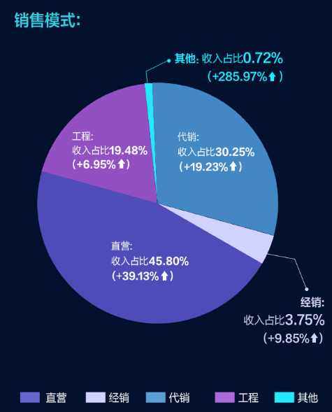 此外,根据全年的财报显示,老板电器直营营收46.47亿元,同比增长39.13%;毛利率67.39%,同比增长5.13%,是代销、直营、工程这三类营收方式中,唯一正向增长的销售模式。