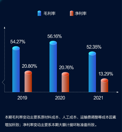 由于原材料成本、人工成本、运输费调整等成本因素增加,老板电器的毛利率全年相较往年有所下滑;净利率则主要受到大额计提坏账准备所致。