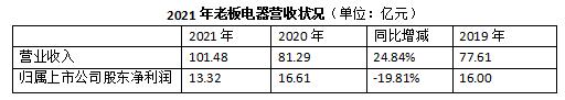 2021年全年的业绩报告。报告期内,老板电器营业收入101.48亿元,同比增长24.84%;基于单项计提坏账准备7.78亿元,归属上市公司股东净利润13.32亿元,同比减少19.81%。