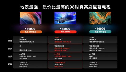 确实,15999元价格可以说是目前98吋在售高刷电视中,最为亲民,性价比最高的一款产品了。从这方面来看,TCL带来的“第一台不忽悠年轻人的98吋真高刷电视”不仅指的是真高刷解决方案,还有年轻人也可以买得起的价格。