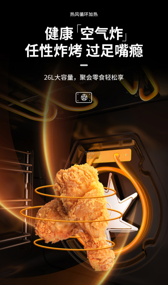 亿田S8M蒸烤独立集成灶,在原有的多重烹饪之上,再次全新推出“风扇烧烤”烹饪模式,天生王者,自带“空气炸”功能。26L烤箱封闭空间内,通过热风循环等模式,完美实现健康「空气炸」。炸鸡翅、炸羊排、炸酥肉,种种食材,从此不经一滴油,即可任性烧烤,过足嘴瘾。而且,通过呼唤随叫随到的内置天猫精灵,无论是家庭聚餐还是自制零食,皆可全程语音控制!厨房有滋有味,生活幸福加倍!