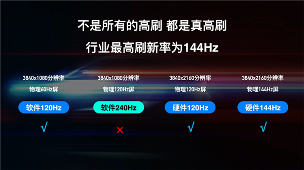 1、物理屏幕:采用一片物理4K 144Hz的真高刷大屏,可无损显示4K 144Hz的图像内容;