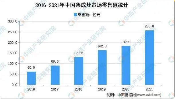 据奥维云网(AVC)数据显示,我国集成灶市场零售额由2016年的60.8亿元增至2020年的182.2亿元,年均复合增长率达31.6%。截至2021年12月底,我国集成灶市场零售额达256.0亿元,同比增长41%,庞大的数字和增长率,印证着集成灶已经逐渐被越来越多人认可,已经成为现代厨房的优先选择。