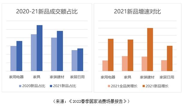 近日,京东消费及产业发展研究院联合新浪家居发布的《2022春季居家消费场景报告》指出,居家场景已经成为消费的重要增长极,其中智能化正在整合居家与家电等相关行业;基于京东消费情况,新一代消费者对自身需求更为明确,在近一年中,京东商品上新数量超千万,新品年度销售额贡献已超六成。同时,新品消费用户整体销量贡献占比达34%,平均消费单价是整体平均的1.4倍。因此,年轻消费者的新品消费偏好给众多细分品类带来了弯道超车空间。
