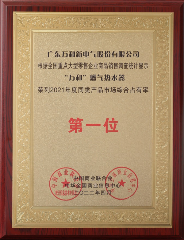 4月22日,中国商业联合会、中华全国商业信息中心联合主办的“2022(第三十届)中国市场商品销售统计结果发布会”以线上直播形式召开,会上对2021年度中国消费品市场销售领先品牌等进行了发布,根据全国大型零售企业商品销售调查统计显示,广东万和新电气股份有限公司旗下的“万和”燃气热水器荣列2021年度同类产品市场综合占有率第一位,这是“万和”燃气热水器连续十八年年获得此项桂冠,万和已成为中国燃气热水器领域当之无愧的领导者。