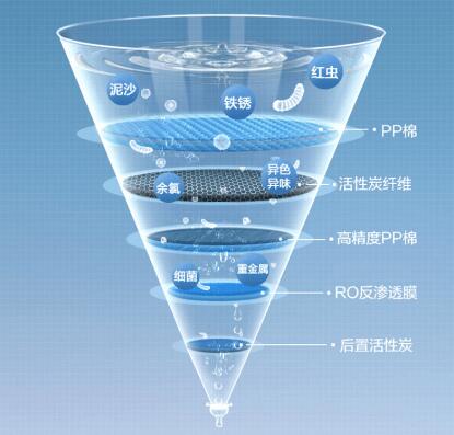 PP棉+活性炭+高精度PP棉+RO膜+PPC后置活性炭,5重过滤结构,有效过滤水中的杂质、有害物质。其中,RO反渗透膜技术,过滤精度为0.0001微米,可滤除细菌、病毒、水垢、重金属、抗生素等,确保每一滴水健康直饮。