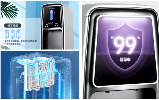 横抽拉式换芯设计,机器在工作中无需关闭净水机也可换芯;智能显示水温、滤芯寿命、水质状况、UV杀菌、缺水、制水、满水,操作简单明了,智能运行;水槽滤水设计,无需手动抽水槽倒水,外接功能省时省力省心;飞利浦紫外线UV杀菌灯管,接水时也在杀菌。