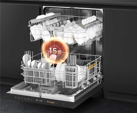 传统洗碗机不仅占据本就不宽裕的房间面积,而且腔体内部空间的利用率并不高,大机身小容量成为行业亟待解决的难题。美的基于深刻的市场洞察,做了大量技术研究,开发的超小型集热泵把加热管集成在泵腔内,洗涤泵的高度尺寸降低至74mm,再次突破行业内集热泵体积大小,通过革命性的小型化及高度的集成化设计,有效压低底部空间,把使用空间让给用户。美的洗碗机增大了内胆的高度尺寸,容积率提升4.1%,整机相同高度尺寸下,开口尺寸更大,装载更多更便利。
