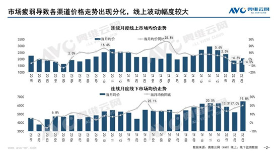 进入22年以来,原材料价格在21年高点基础上进一步提升,企业成本端压力一涨再涨。面对成本与销售端的压力,企业端选择在各渠道采用不同的营销策略,导致市场各渠道价格走势出现分化。线上市场价格同比小幅下降,2月均价同比下降6.8%,3月下降4.5%。线下市场则延续提价趋势,增长周期长达24个月。