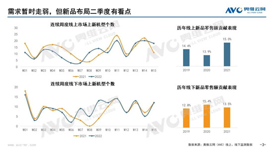一季度,市场需求虽然疲软但市场韧性仍在,冰箱企业把握当下超薄、保鲜、大容积的市场需求,在新品布局方面稳步推进。各品牌新品陆续官宣上线,例如容声超空间、海信真空休眠二代、美菱星辰系列等等。据奥维云网(AVC)监测数据,一季度线上线下市场连续周度上新机型基本与21年趋同。根据历年新品零售额贡献来看,线上市场2019年至2021年新品贡献分别为14.4%、13.9%、15.0%,线下分别为12.8%、15.4%、13.5%,连续年度维持在较为稳定的区间,预计今年仍将延续这一趋势,新品带来的增长动力可期。