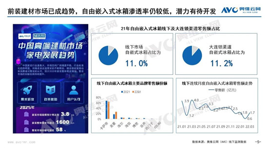 据奥维云网(AVC)地产大数据,在老房改造需求刺激和精装修政策激励的双重促进下,预计2025年家装行业市场规模将达3.8万亿元,家装整体需求可超过1600万户。随着前装市场快速发展,家电购买前置化、家电与家装融合的大趋势已成为行业共识。冰箱企业自然也察觉了前装市场的巨大潜力,利用自由嵌入式产品成功打开了市场。据奥维云网(AVC)监测数据,2021年线下自由嵌入式冰箱零售额占比为11.0%,主要渠道大连锁中占比也仅为11.2%,现阶段渗透率仍处于较低水平,前装市场能否成为自由嵌入式冰箱的新蓝海,未来能否在新渠道获取新机会是摆在企业面前的新课题。