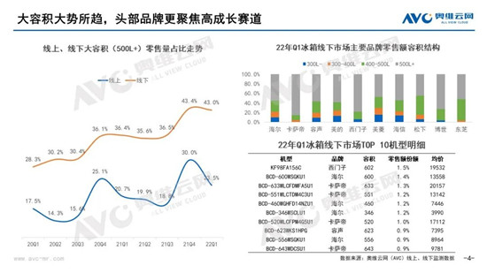 受益于存储需求的精细化,大容积市场持续高速增长。据奥维云网(AVC)监测数据,线下500L+产品零售量占比由20年Q1的28.3%增长至22年Q1的43.0%,线上则由17.5%增长至21年Q4的30.0%,虽然22年Q1线上受四季度促销节结构占比较高影响,出现一个短期的波动,但整体来看仍保持增长的趋势。品牌方面,22年Q1海尔、卡萨帝、容声、美的、西门子等品牌在线下市场500L+占比均超5成,头部品牌布局更加聚焦高成长性赛道,加大重点市场的开拓。