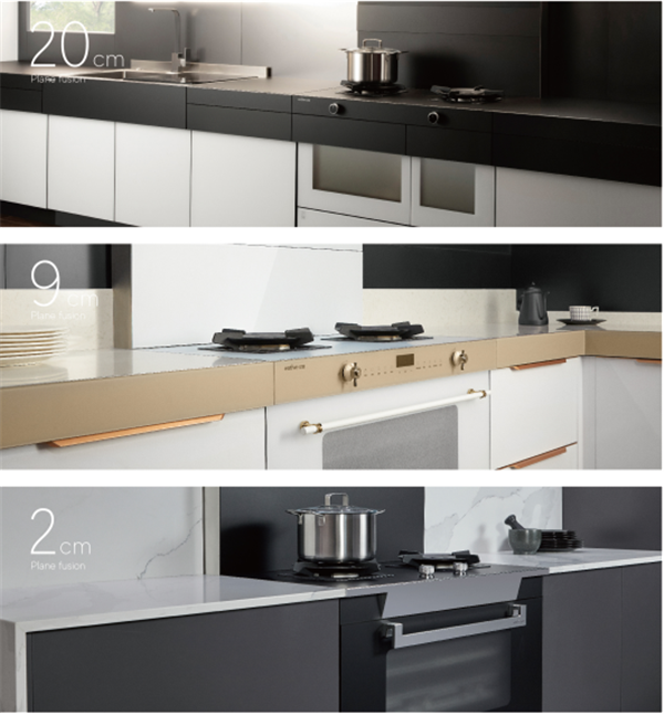 亿田高端定制厨房独创厨电&台面水平融合系统,实现“宽域窄域,随心所欲”的尺寸定制,轻松驾驭不同台面。