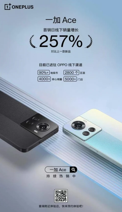 4月26日,有颜有料的性能王牌一加Ace线上线下全渠道正式开售,不仅在线上迅速拿下OPPO商城、京东、天猫手机单品销量和销售额双冠军,线下渠道的销量增长也非常迅猛,首销日线下销量增长率达到257%,首销火热。