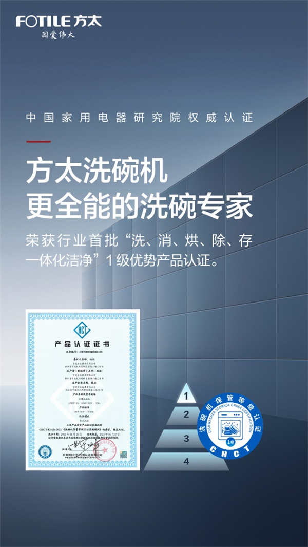 正如中国家用电器研究院检测所副总工程师岳京松所言,“洗碗机保管等级”产品认证以洗碗机诸多关键性能指标为基础评价产品,是对产品品质的权威肯定,也饱含了中国家用电器研究院对提升家用洗碗机产品质量、促进行业技术进步而努力的初心。能获得首批“洗碗机保管等级”产品认证,充分说明方太洗碗机在产品设计、性能、创新等方面居于国内行业领先水平。