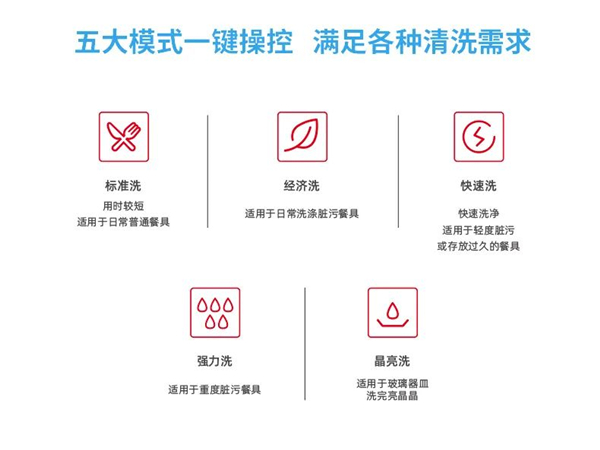 一台机器能解决的家庭矛盾,绝不用”手“解决,DC-90JX6集成水槽洗碗机的智能,也是无懈可击的。五大清洁模式:标准洗、经济洗、快速洗、强力洗、晶亮洗,根据碗盘的数量或者脏污程度,选择更适合的洗涤方式。