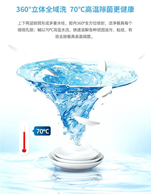 德意DC-90JX6集成水槽洗碗机,针对中式烹饪习惯,利用独创的大水压技术,有效增强冲刷水压达29kPa,形成高压喷淋,360°涡轮高压冲洗,可以达到强力洗、精准洗、全域洗的效果。