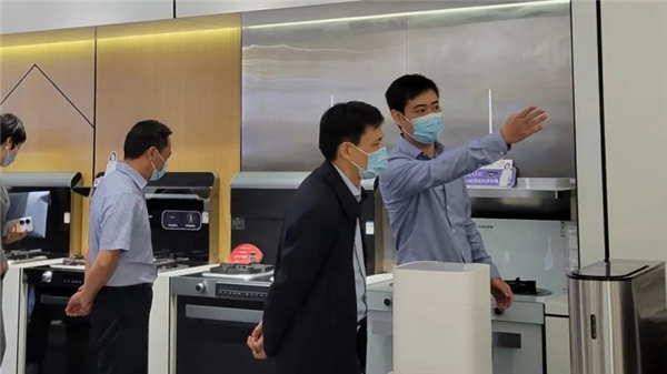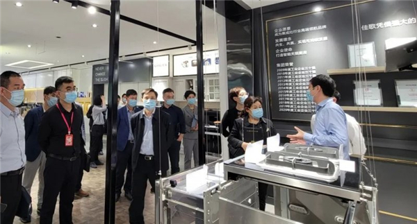 随后一行人来到了佳歌现代化产品展示厅,整体环境侵入式场景化设计,能够充分感受到佳歌产品的用心与匠心。全面了解了佳歌的集成灶、集成水槽、洗碗机等全系列厨电产品矩阵后,邵主任对佳歌集成灶的技术实力和创新工艺给予高度评价。