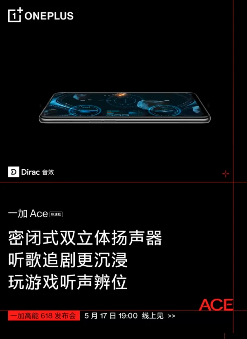 在618购物节到来之际,一加持续发力带来一加Ace竞速版,满足更多追求性能和游戏体验的用户。一加Ace竞速版将于5月17日19:00正式发布,更多新品信息请关注一加官网、一加手机官方微博等渠道。