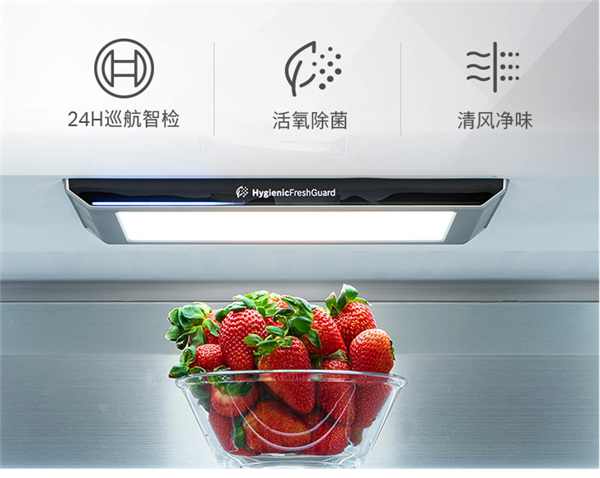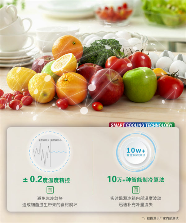 此外,该产品搭载的零度维他保鲜技术能够进行双区存储,温湿双控,带来高达三倍保鲜时长5的效果:“清脆果蔬”空间最高可达98%超高湿度,减少果蔬在风冷冰箱内的失水现象,果蔬保存一周依然水分满满,入口清脆;“原味生鲜”空间则是肉食专属储藏区,可精准控温和较低的湿度,保障肉类的保鲜效果。控温方面,还有智能精控恒温技术加持。此技术通过智能动态恒温制冷算法,能实现±0.2℃6精准控温,避免忽冷忽热造成细菌滋生带来的食材腐坏,即使存储15天后依旧健康营养。