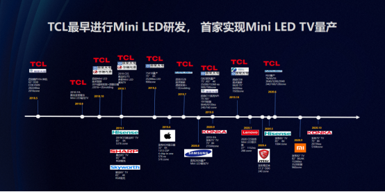 Mini LED其实是一种更为先进的显示技术,能够脱颖而出,与其自身超高对比度、超高亮度、精准控光、超长寿命、超大尺寸等优势密切相关。Mini LED显示技术的强势崛起对于中国厂商来说是重要机遇,作为最早开始Mini LED技术研发的企业,早在2018年TCL就敏锐地发现了Mini LED的广阔市场前景,并在Mini LED技术上进行全方位布局。2019年,TCL发布了全球首款Mini LED电视,并且一路高歌猛进,市场份额一度达到了Mini LED领域的90%以上,成为了Mini LED赛道上绝对的领跑者。