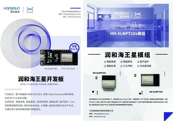 基于W800芯片,润和软件推出了OpenHarmony模组和开发板海王星系列HH-SLNPT10x:具备丰富的数字接口,内置QFlash、SPI、UART、GPIO、I2C、I2S、7816等。HH-SLNPT100开发板已顺利通过OpenHarmony 3.1 Release版本兼容性测评,获得OpenHarmony生态产品兼容性证书,普适千行百业各类IoT场景的产品开发。